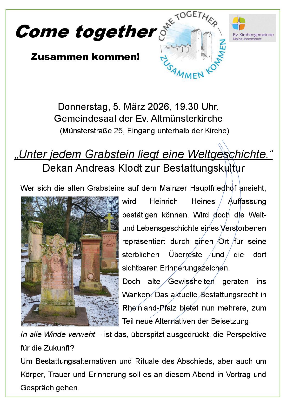 Einmal im Monat findet in der Altmünsterkirche eine besondere Veranstaltungsreihe mit dem Titel "Come together–Zusammen Kommen" statt. Bei einem abwechslungsreichen Programm gibt es die Möglichkeit, nach Impulsen und Informationen über das Gehörte ins Gespräch zu kommen, miteinander unterwegs zu sein und Gemeinsames zu erleben.